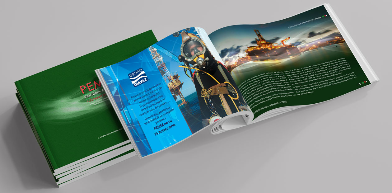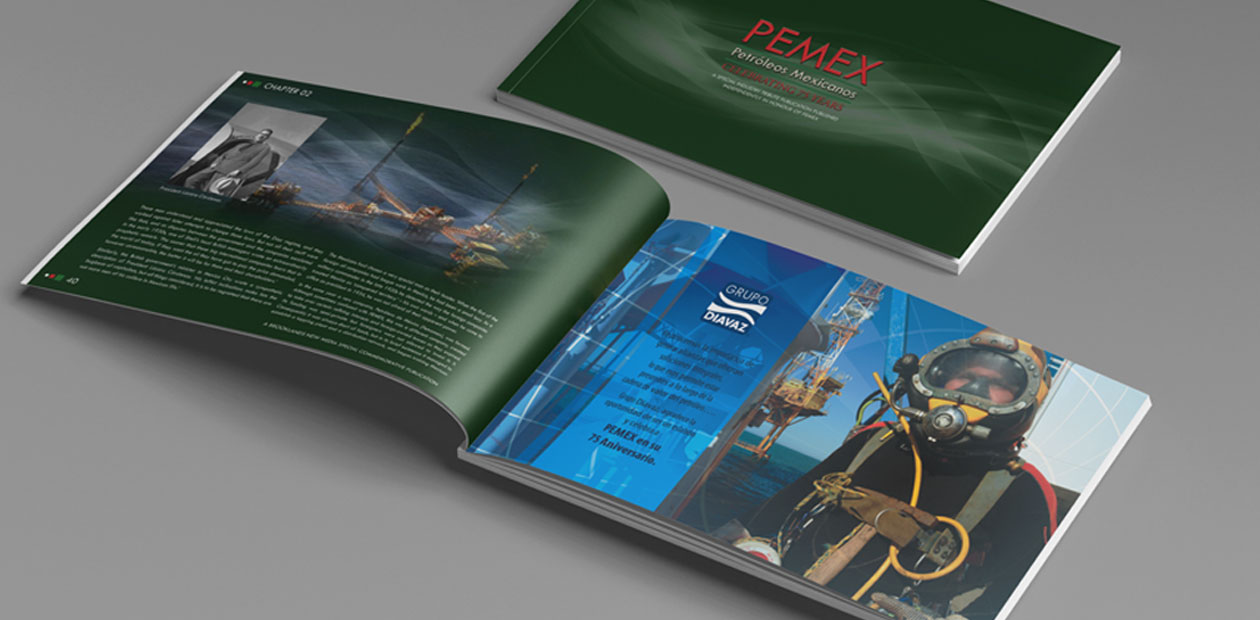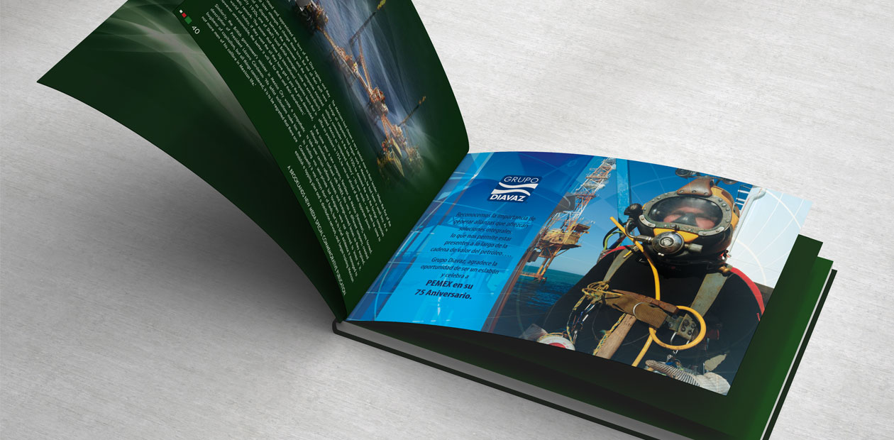 Anuncio impreso en la publicación conmemorativa "PEMEX Petróleos Mexicanos - Celebrating 75 Years", para conmemorar el 75 aniversario de PEMEX.