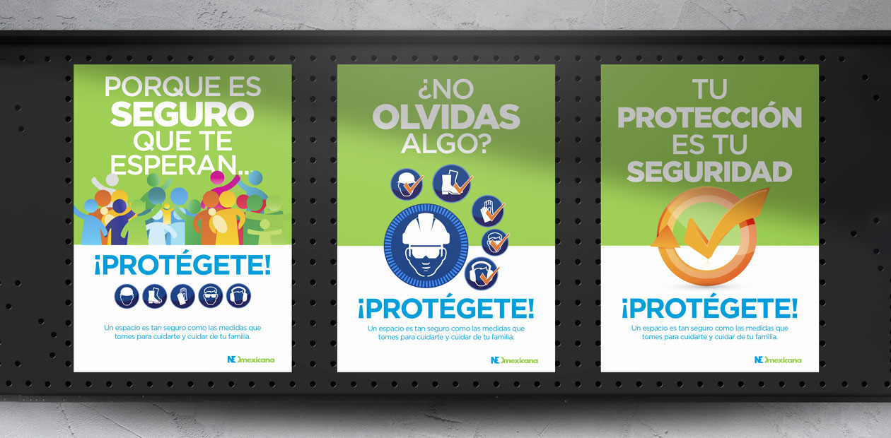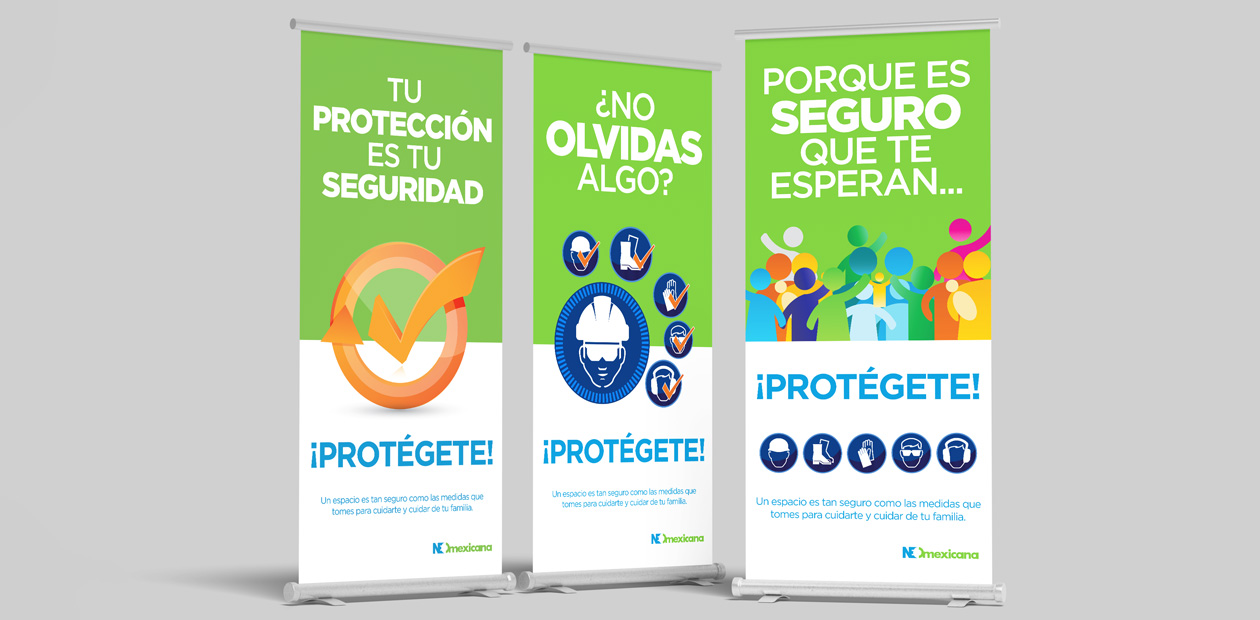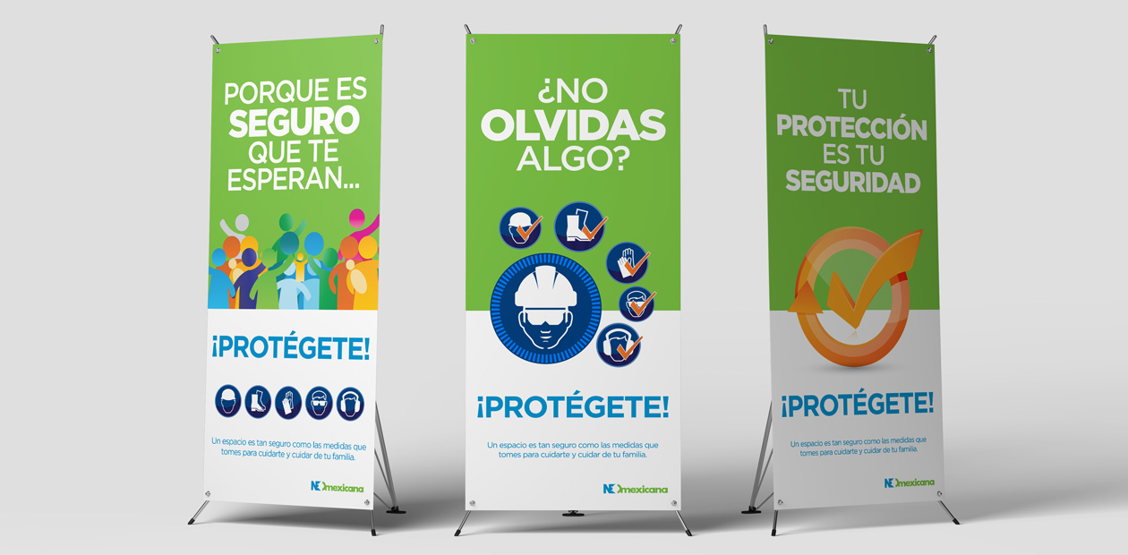 Diseño de banner, roll-up y póster para campaña de seguridad industrial.