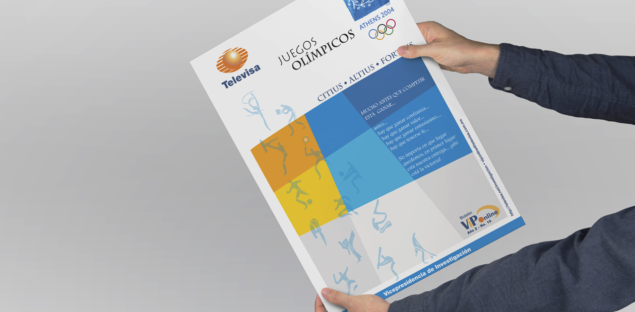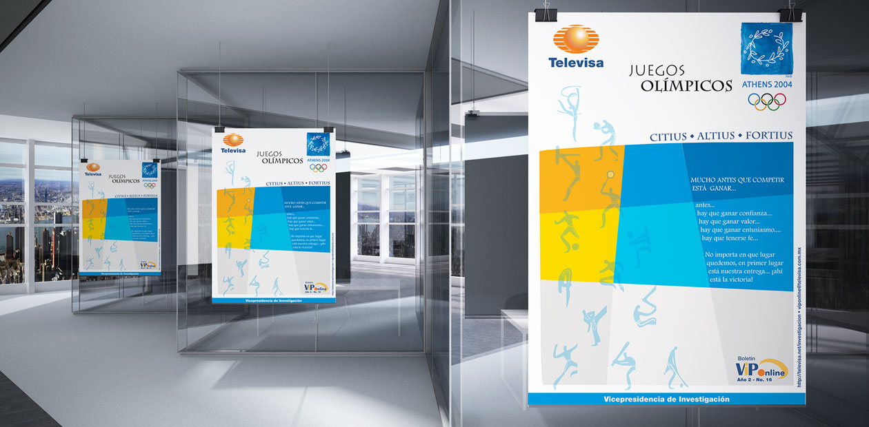 Diseño de póster para difusión del evento olímpico celebrado en Atenas en 2004, trabajo de comunicación interna para la Vicepresidencia de Investigación de Televisa Network.